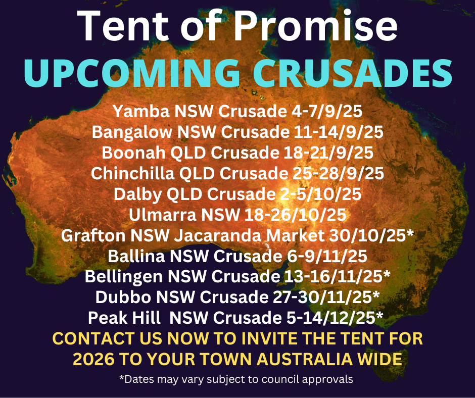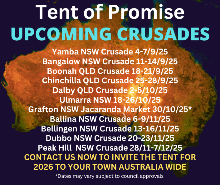 Since 1993 the Tent of Promise has missioned across all states of Australia, seeing tens of thousands come into the Kingdom of God and many hundreds of thousands getting up towards a million people touched by the ministry across Australia and Africa.